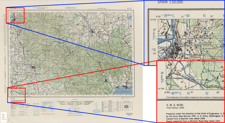 Esta es la Hoja Cartográfica 1:50,000 de Girona, de la primera edición de 1943, cuando esto lo hacía el Ejército de Estados Unidos por supuestas razones de seguridad :). Mapas de este tipo se encuentran casi de todos los países, disponibles para descarga.