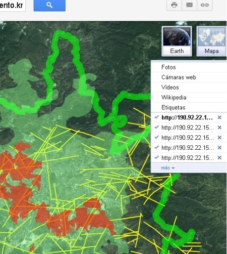 En este caso, por ser un servicio montado como iframe, hay que hacer botón derecho para ver las propiedades del código e identificar el IP donde está hospedado. Luego aquí buscar el html; en caso que no sea una web dinámica como lo es este caso –y al momento de este post-. Si los datos no están servidos vía wms o son ficheros no almacenados en una base de datos, podrán verse las rutas de las capas kml/kmz.