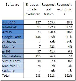 AutoCAD ha respondido más allá de lo que he hablado de él, gracias a su popularidad y vean que gracias a ello, IntelliCAD responde de segundo. Luego ArcGIS seguido de Google Earth para cerrar los primeros cuatro.