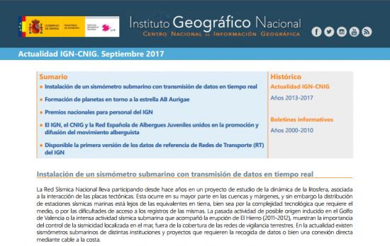 Los Boletines del IGN y CNIG tienen por objeto difundir las actividades de la institución. Accesibles en formato PDF, el último publicado es del mes de Septiembre. Como es de esperarse, se puede acceder a los números anteriores con sólo escoger el año y luego el mes del boletín deseado.
