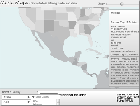 Gracenote no es una web cartográfica, pero su diseño es muy intuitivo. Mapas integrados en Flash que al seleccionar el país te muestra los artistas y álbums más escuchados.